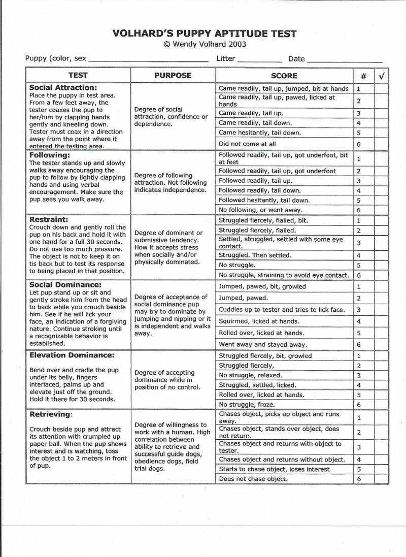 The Volhard “Puppy Aptitude Test or “PAT” was created by Joachim and Wendy Volhard as a way to test behavioral tendencies and predict what a puppy will be like as an adult also commonly called a “Puppy Temperament Test” or “Puppy Personality Test”. The test is ideally performed on puppies at 49 days old (7 weeks).